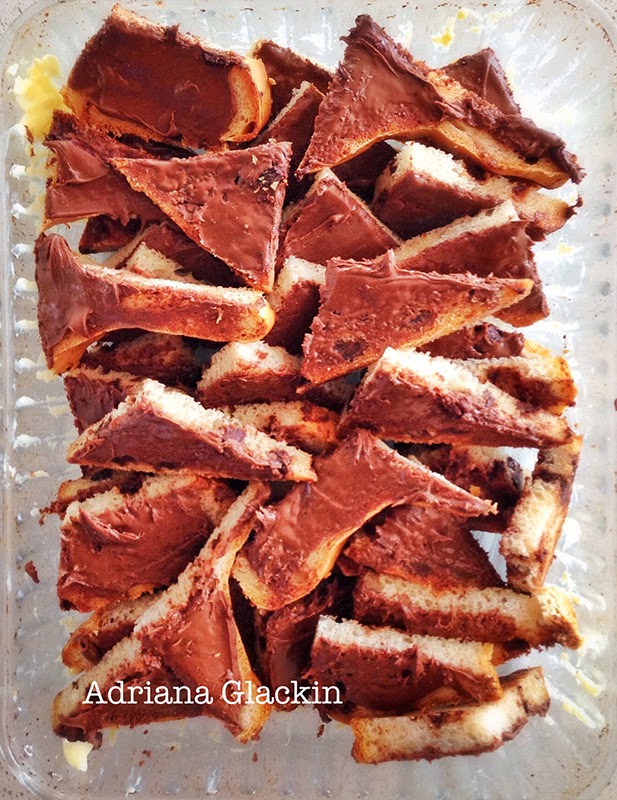 4. Arrange the Nutella triangles in the baking dish. You can be as neat or as messy as you like. Overlap the bread if that's what's going to make you happy. Sprinkle that dash of Marsala over the Nutella triangles. Consume any leftover Nutella triangles that don't fit into the baking dish...it would be rude not to...